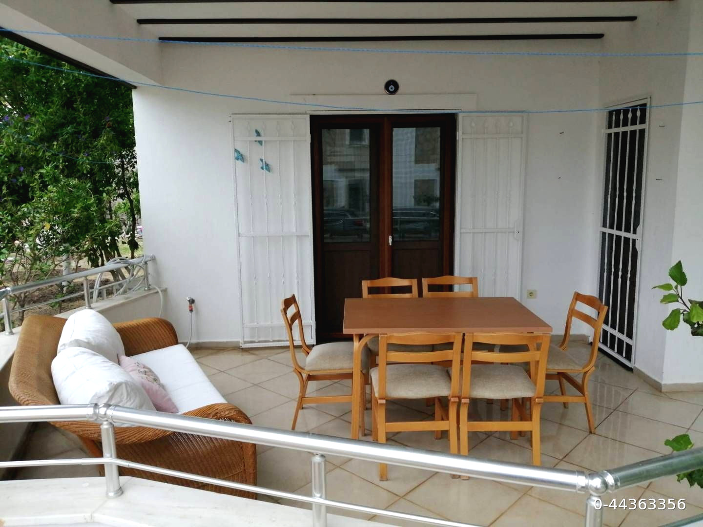 İkinci Ortak Banyo+WC, Amerikan Mutfak, Geniş bir balkon ve Ahşap masa sandalye var.